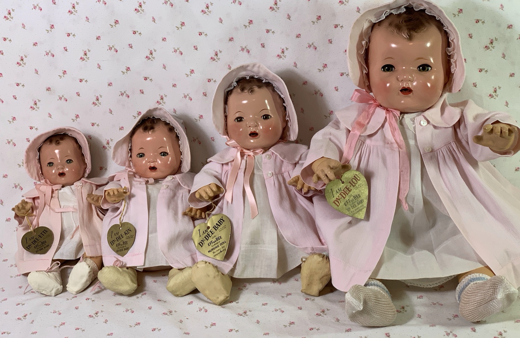 Today’s photo shows my little Dy-Dee girls dressed all alike in their original slips, dresses, coats and matching hats. Each holds her original heart shaped ‘gold’ paper hang tag identifying her size by name. The dresses are made of white cotton lawn with ‘white-on-white’ embroidered Peter Pan style collars, with high waisted pleated skirts. Lovely tailored pink cotton twill coats with matching bonnets finish their look… all dressed up and ready to visit Grandma!